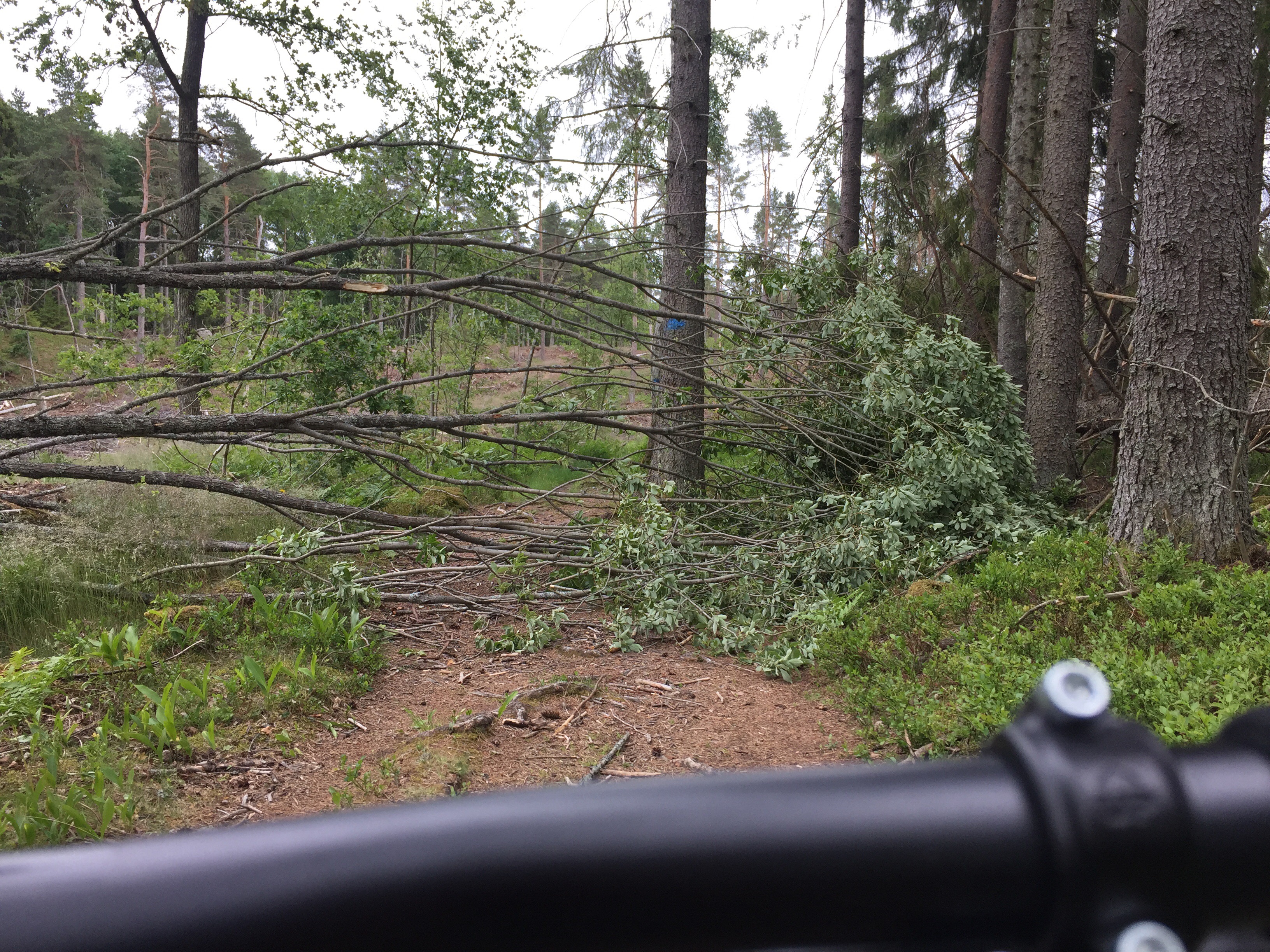 Det blåsiga väder vi haft i veckan hade dock gjort att en del träd lagt sig takt över leden, så ibland fick man vara väldigt akrobatisk för att ta sig fram. Idag mötte jag både andra cyklister, terränglöpare och vandrare. Två gånger stannade jag dessutom och pratade lite med dessa för mig okända människor. Två av dem guidade jag så att de inte skulle gå vilse, för de visste inte riktigt vart de var på väg. De andra som jag mötte var ett par nybörjarcyklister i skogen och vi möttes där det var som mest stökig terräng och i stort sett hopplöst att kunna cykla. Jag gladde dem med att fortsatte de bara en bit till, så skulle MTB paradiset öppna upp sig.