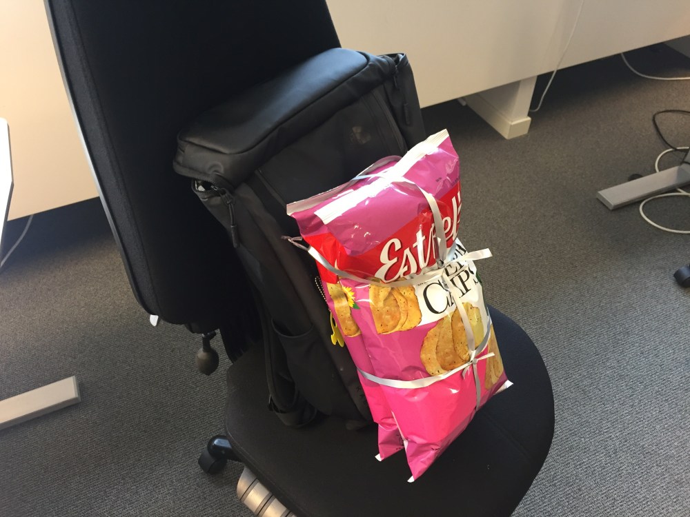 På jobbet idag, så delades det ut chips i stora lass. Tror det var chips som blivit över, då ICA fyllde 100 år och vi hade tillställningar runt om i landet för alla anställda. Jag norpade 2 påsar och tänkte väl inte vid tillfället hur jag skulle få hem dem med min slimmade pendelcykelryggsäck. Med lite presentsnören, så knöt jag ihop påsarna och sedan band jag fast dem på utsidan av ryggsäcken. Funkade klockrent.