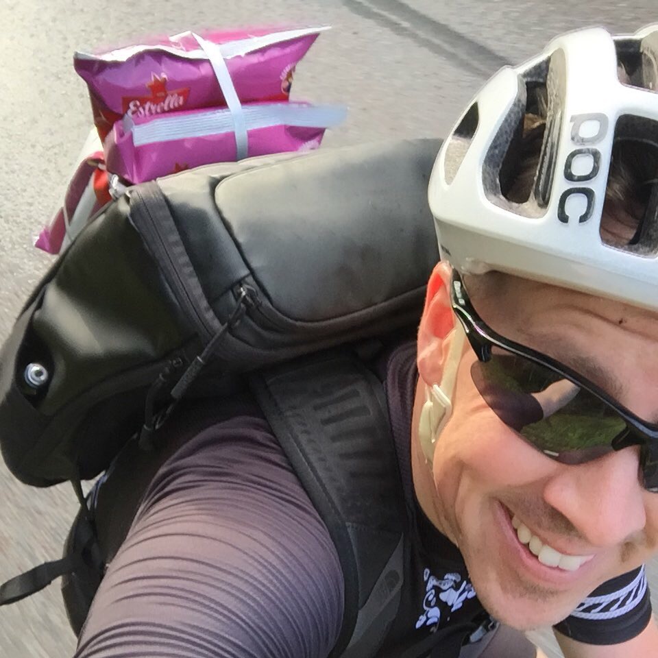 När jag susade fram på väg 276 in mot Åkersberga, fick jag glada miner från bilister som nog tyckte jag såg lite kul ut med mitt snigelbo av chipspåsar på ryggen 🐌 Jag tror att mataffärerna i Åkersberga ökade sin försäljning av chips från Estrella ikväll efter min rullade reklam.