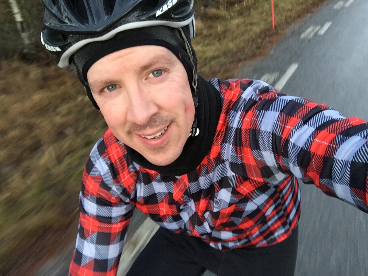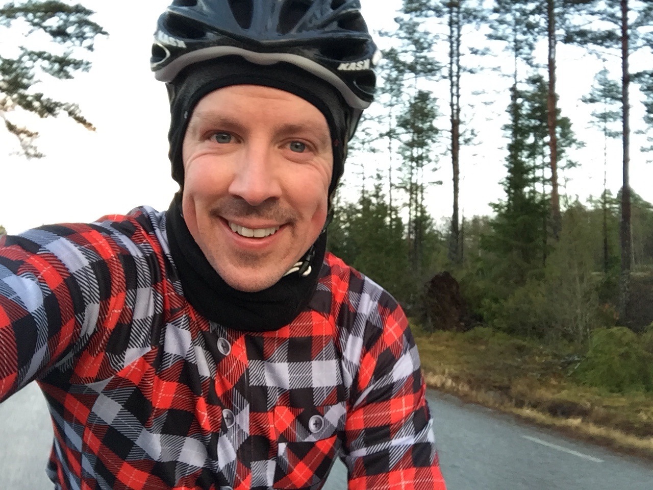 Idag var det dock 5 plusgrader, så jag tog på mig en halvtjock cykeltröja som underställ och så körde jag med Skoghuggartröjan ovan på den, så nu har jag premiärcyklat med den. Det är dock lite svårt att få en bra överblick på den fina tröjan när man tar en selfie.