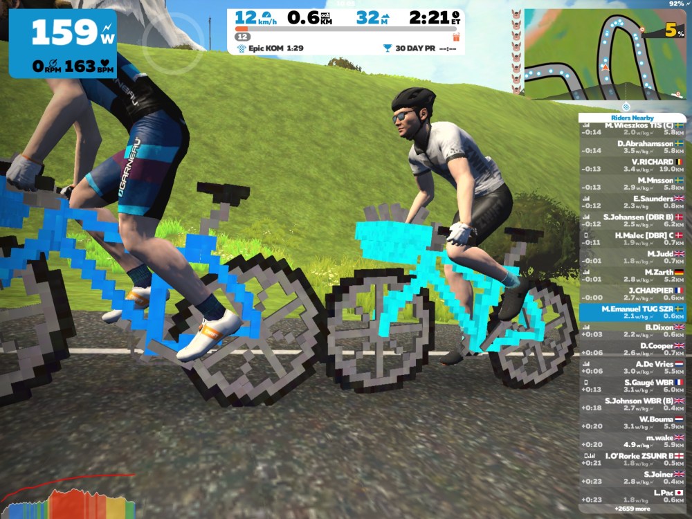 1 april och Zwift hade gjort sig lustiga genom att alla cyklister körde på en pixelerad cykel som såg ut att vara byggd av lego 😂