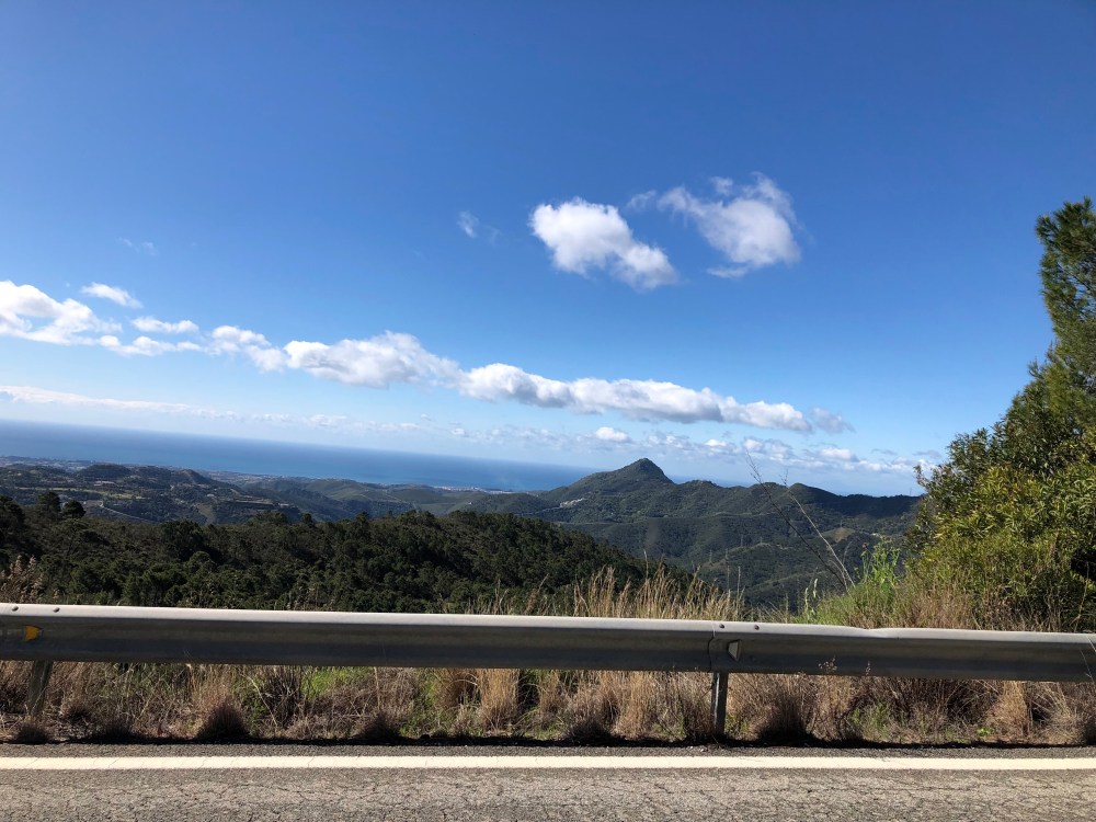 På vägen ned mot Marabella igen var vi tvungna att stanna flera gånger för att återfå värmen lite. Robert T hade också valt att avbryta färden mot Ronda pga risken för att få köldskador. Han anslöt också till oss strax innan vi hittade vi en mysig restaurang med en solig terass som hade en makalös utsikt, där vi äntligen kunde få i oss en varm kaffe, cola och en bocadillo.
