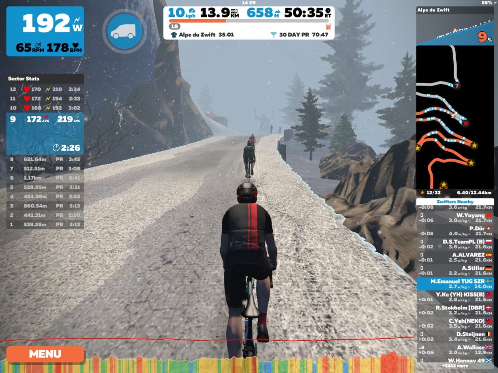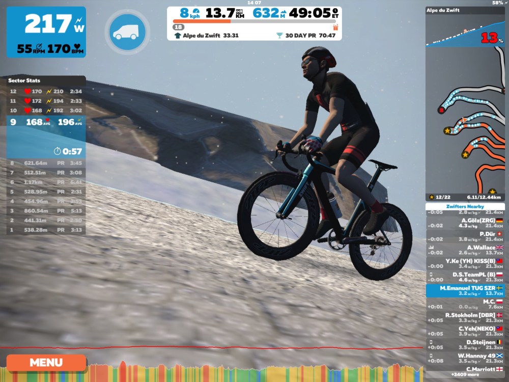 Det blev ett Zwiftpass uppför mäktiga Alpe du Zwift med sina 1 000 höjdmeter. Jag skulle egentligen kört ett race uppför där, men missade starten på grund att jag inte hann få ordning på alla saker innan starten. Då valde jag istället att cykla uppför berget på egen hand utom tävlan.