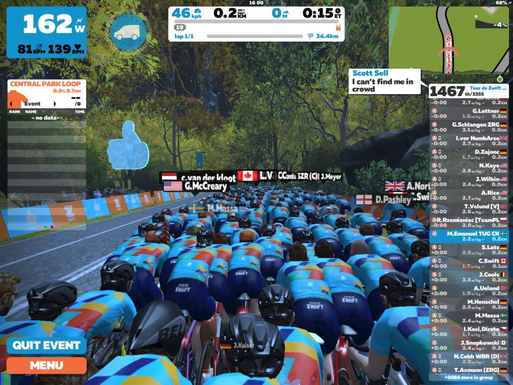 Idag öppnade Stage 2 i Tour de Zwift och jag hade anmält mig till loppet som startade kl 16:00. Idag var det bara en A-grupp och C-grupp. I (A) kan alla oavsett hur stark eller svag man är delta och i (C) är bara tjejer tillåtna. När A- och C-gruppen släpptes iväg var vi över 3 300 startande och grafikkorten i datorerna och surfplattorna fick jobba hårt. Skärmen var som en mystack med blåa cyklister. Jag har aldrig kört ett lopp med så många deltagare i och det tog en rätt bra stund innan det gick att se sin egen Zwiftavatar i mängden.