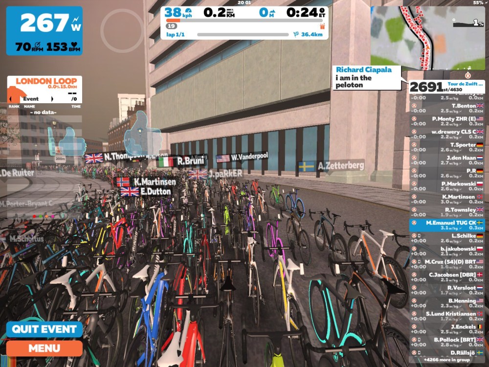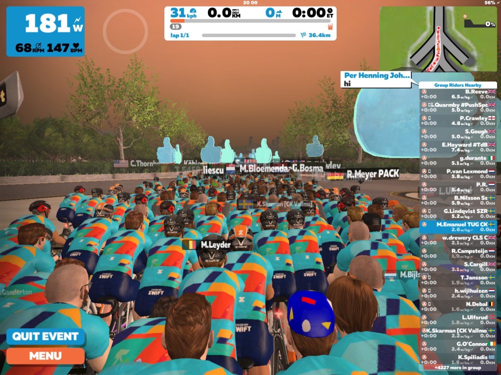 När jag loggade in på kvällens event som jag anmält mig till kl 20:00 så såg jag hur deltagarantalet snurrade uppåt i en rasande takt även när loppet startat, då man i dessa lopp tillåter ”late joining”. Jag tror att det totala antalet var ca 5 500 och om grafikkorten fick jobba hårt häromdagen då vi var 3 400, så kändes det som min iPad nästan nått sin maxkapacitet på vad den kunde hantera. Det var Zwiftavatarer precis överallt på skärmen och vid något tillfälle försvann till och med gubbarna och jag var bara omgiven av hundratals självcyklande cyklar.