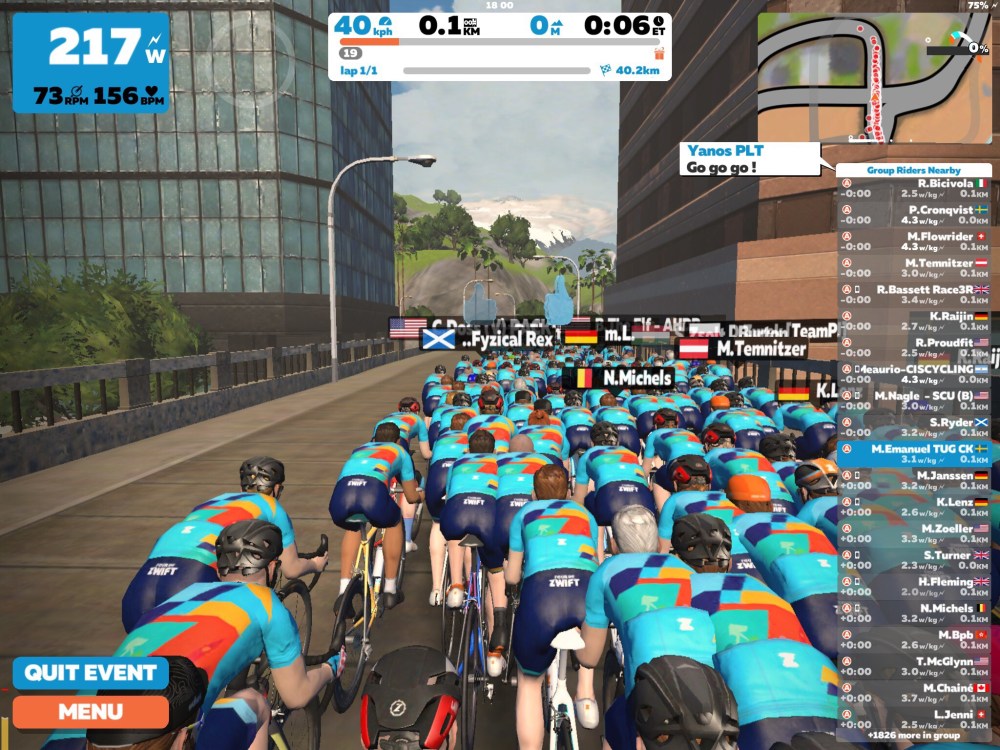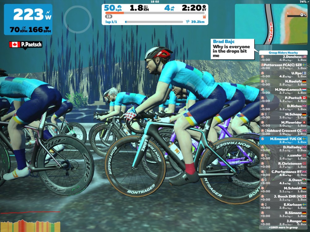 En ny upptäckt idag var att Zwift plockat bort vilken placering som man har under loppet. Det är säkert pga att det inte är ett race eller för att det tar för mycket kraft av deras servrar att hålla reda på allas placering hela tiden. Lite tråkigt tycker jag, då det varit en liten morot att ta i lite mer ibland.