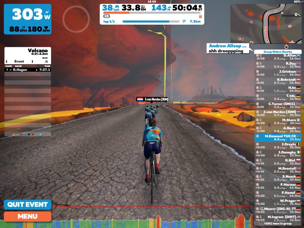 Därför var det bara att vänta med fredagsmyset och förbereda sig på strax över 40 km cykling och idag var det den påhittade världen Watopia och banan Volcano Climb After Party. Det var ett platt lopp som förr med en liknande stigning på slutet som förra etappen.