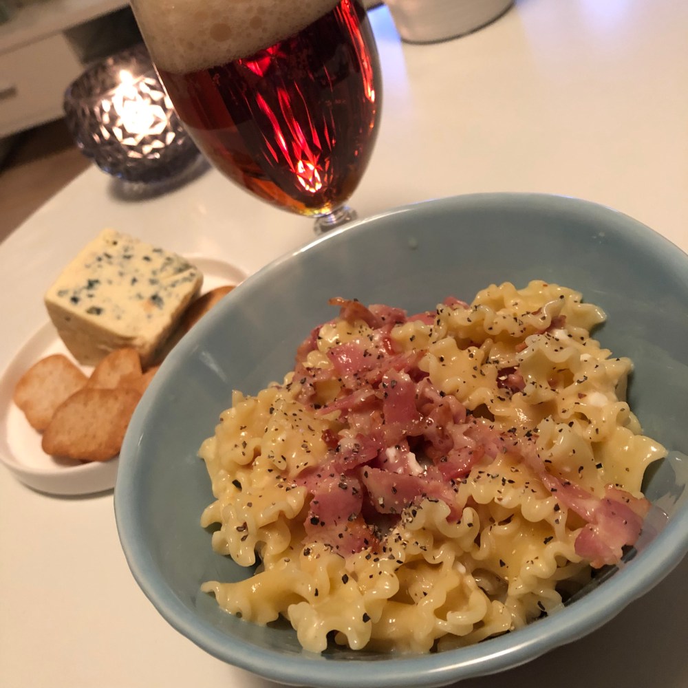 Efter loppet lyxade jag till med en smarrig vitlöksdoftande baconpasta och lite kex med ost för att samla på mig lite energi inför intervallpasset imorgon.