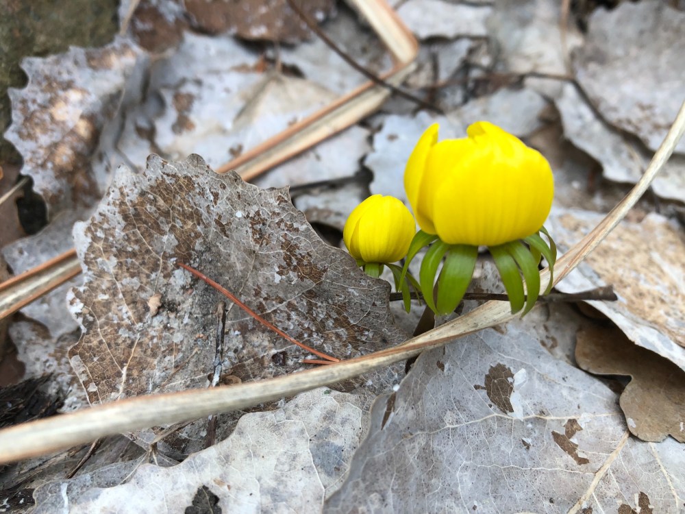 En jämngrå himmel mötte blicken när rullgardinen åkte upp imorse. Men något soligt gult strålade mot mig som en liten lysmask bland de brungråa löven i rabatten. Det var de första Vintergäcken jag planterade i höstas, som nu kämpat sig upp för att sprida lite vårglädje.