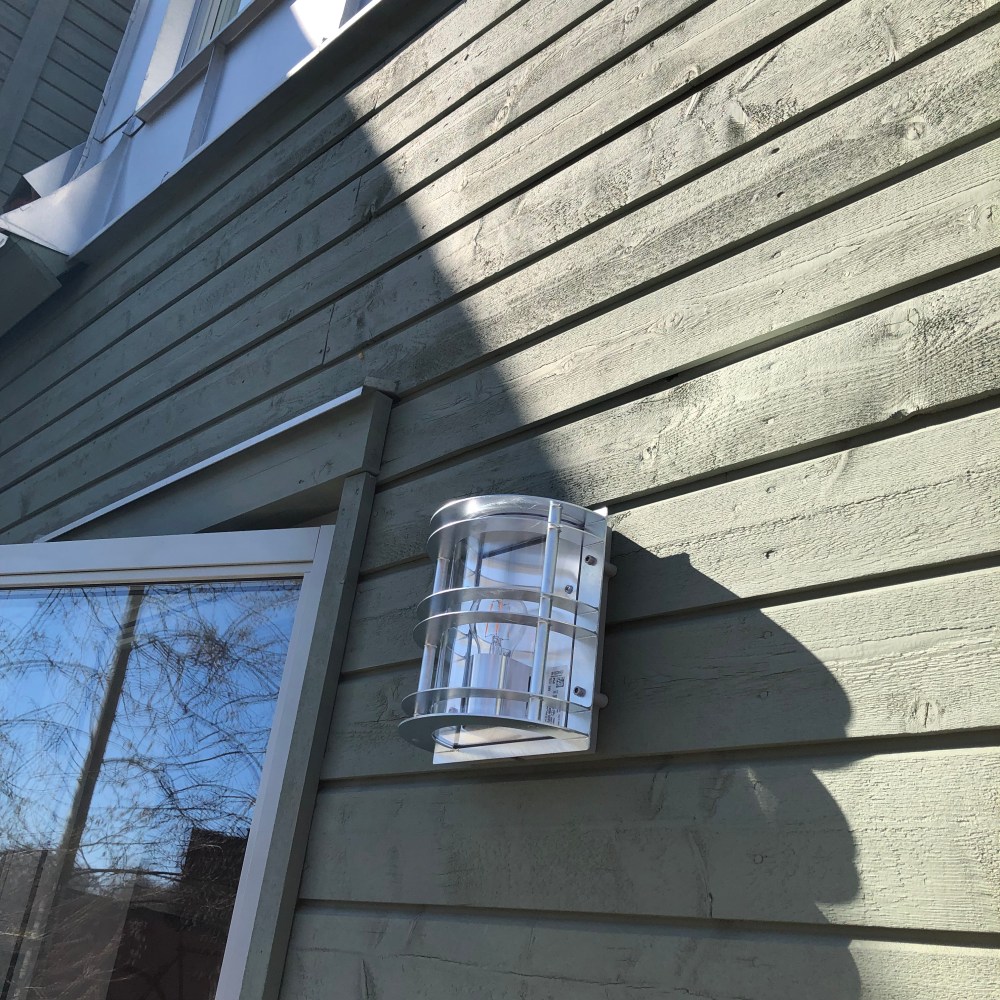 Jag började förmiddagen med att fixa med min nya utelampa på baksidan, då den förra som var en lyktmodell slets loss från väggen i ett snöras i vintras. Nu blev den variant i samma serie, men en välvd sort som inte sticker ut så långt. Blev tjusigt tycker jag!
