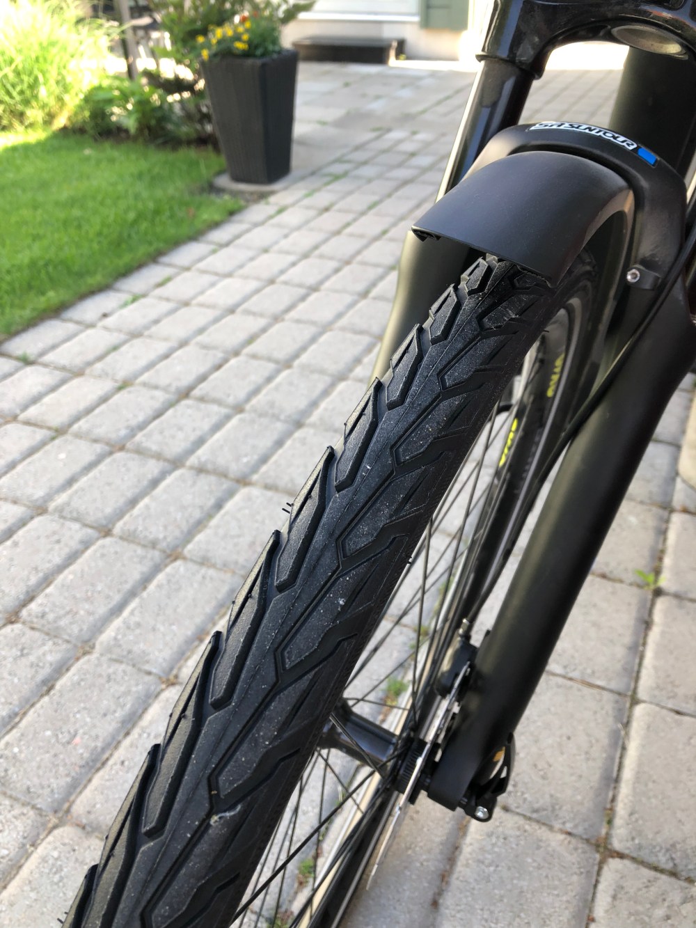 Jag och el-cykeln firar nu en vecka ihop och känslan att cykla till jobbet är lekande lätt. Ett litet problem är dock att cykeln levererades med riktigt feta MTB-däck. Så feta att de stundtals tar i stänkskärmarna där bak. Jag vill ha stänkskärmar på, så de vill jag inte montera bort. Dessutom sitter det en del fiffiga saker som t.ex. inbyggd baklampa i den bakre.