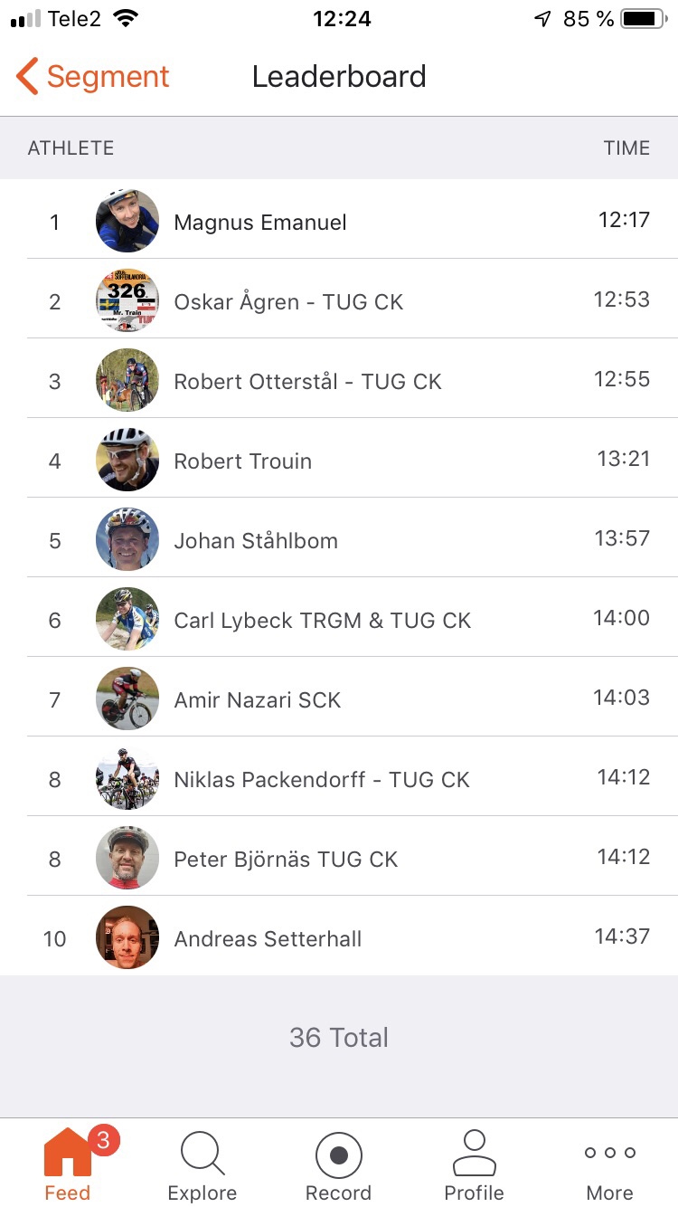 Segmentets topplista med medlemmar från Team Utan Gränser som kört där.