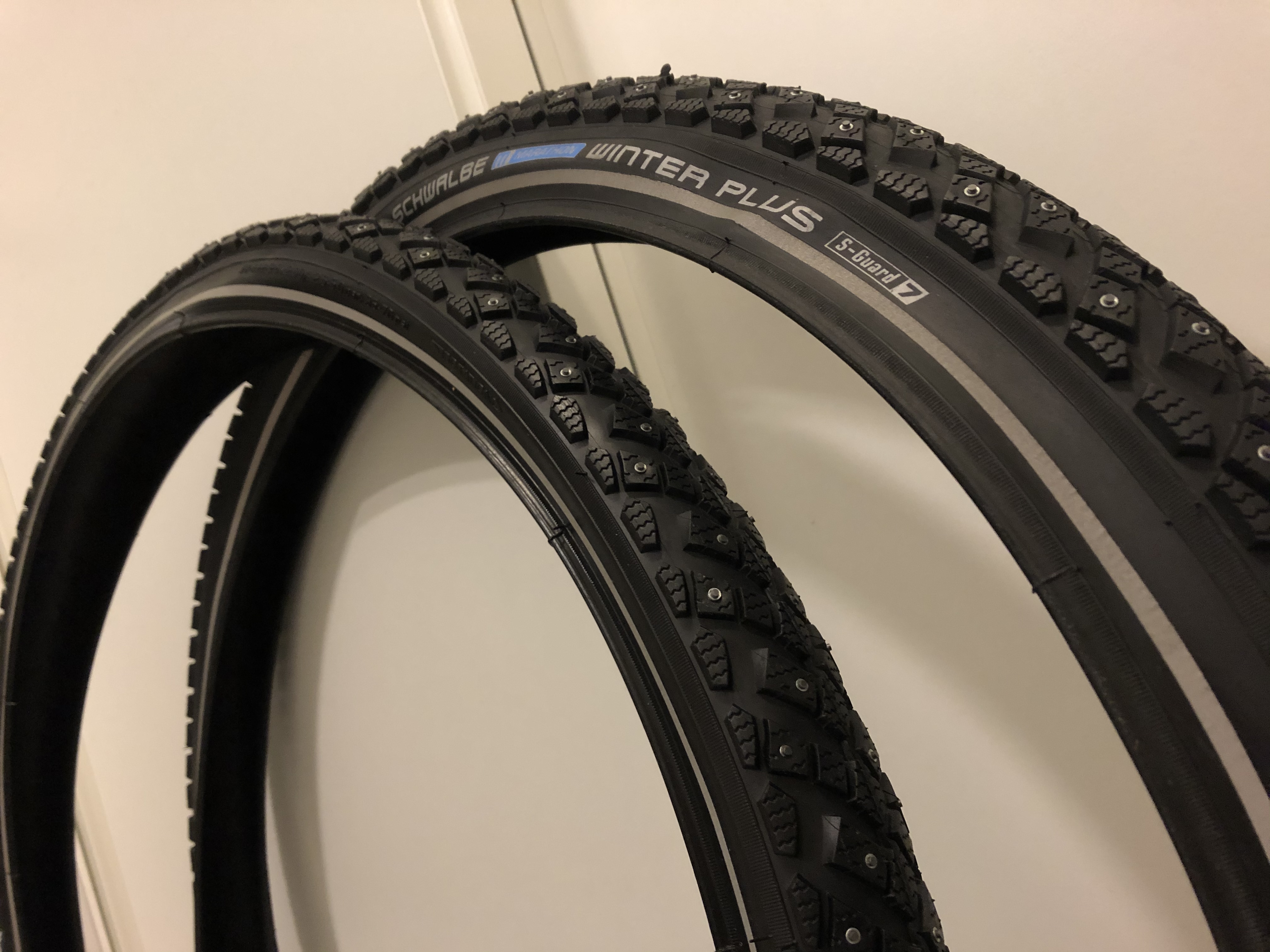 Det var mig ett par rejäla däck man köpt. De väger in på tunga 1,2 kg styck med sina 209 dubbar i varje däck. Det är inga vinterdäck i MTB-utförande jag köpt till min E-MTB. Jag har istället valt ett par mer klassiska pendelcykeldäck, men som har samma storlek som mina MTB-däck som jag kör med resten av året.
