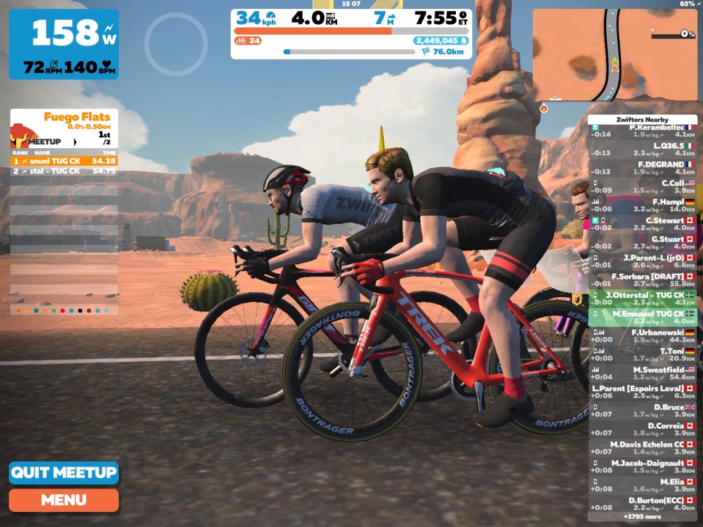 Igår körde jag och min kompis Jörgen en meetup i Zwift som är precis som det låter, en träff med någon eller några på en bana i Zwift. Det är givetvis andra cyklister runt omkring en också, men på skärmen är vi utmärkta med en annan färg i listan, vilket gör det lättare att se vart vi ligger i listan om man skulle hamna i en grupp med många cyklister. Det är lite kul att köra detta, även om man inte pratar med varandra. Vi hade dock Zwifts chatt igång, så vi kunde bubbla lite med varandra när vi orkade.