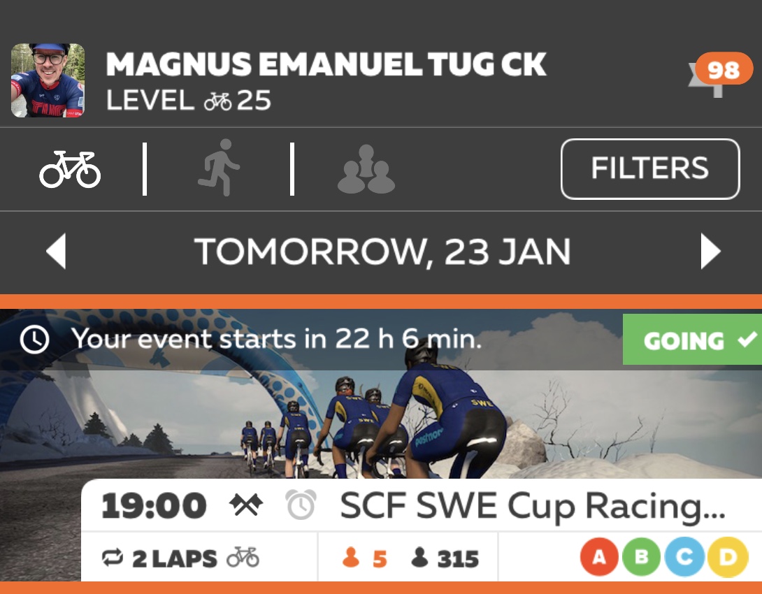 Jag gör det mest för att utmana mig själv lite och för att tävla i Zwift är så himla kul. Jag har inte så stora förhoppningar på någon bra placering. I ett race som detta är det väl gissningsvis créme dela créme som deltar i alla klasser och så lilla jag 😃