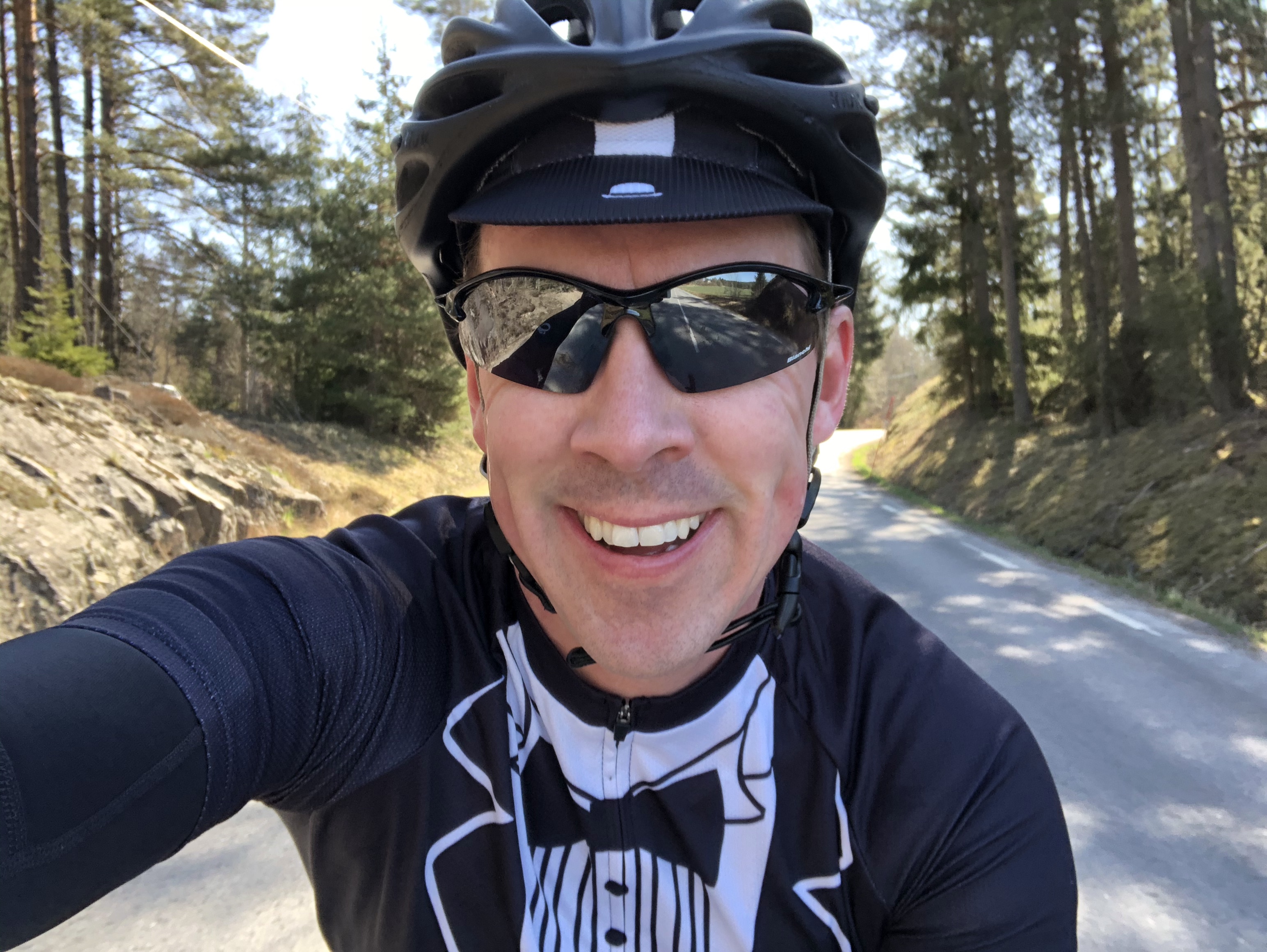 Jag tänkte att idag skulle jag sprida lite glädje och klä upp mig lite extra, genom att svira på mig finaste smokingcykeltröjan. Den får man alltid glada miner från medtrafikanter och det var inget undantag idag. Visst bryter den säkert alla etikettsregler som finns inom cykelsporten, men ibland är det skönt att bryta mot dessa och bara sprida glädje 😃