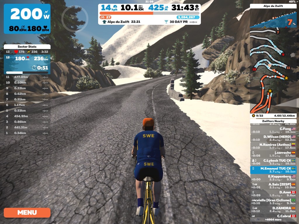 Alpe du Zwift består av en klättring med 21 kurvor och med en stigning som snittar på 8,5 %. När jag började klättringen hade Carl redan passerat första kurvan, så jag var inte så långt efter honom. Men det tog mig halva sträckan uppför berget innan jag hann i kapp honom.