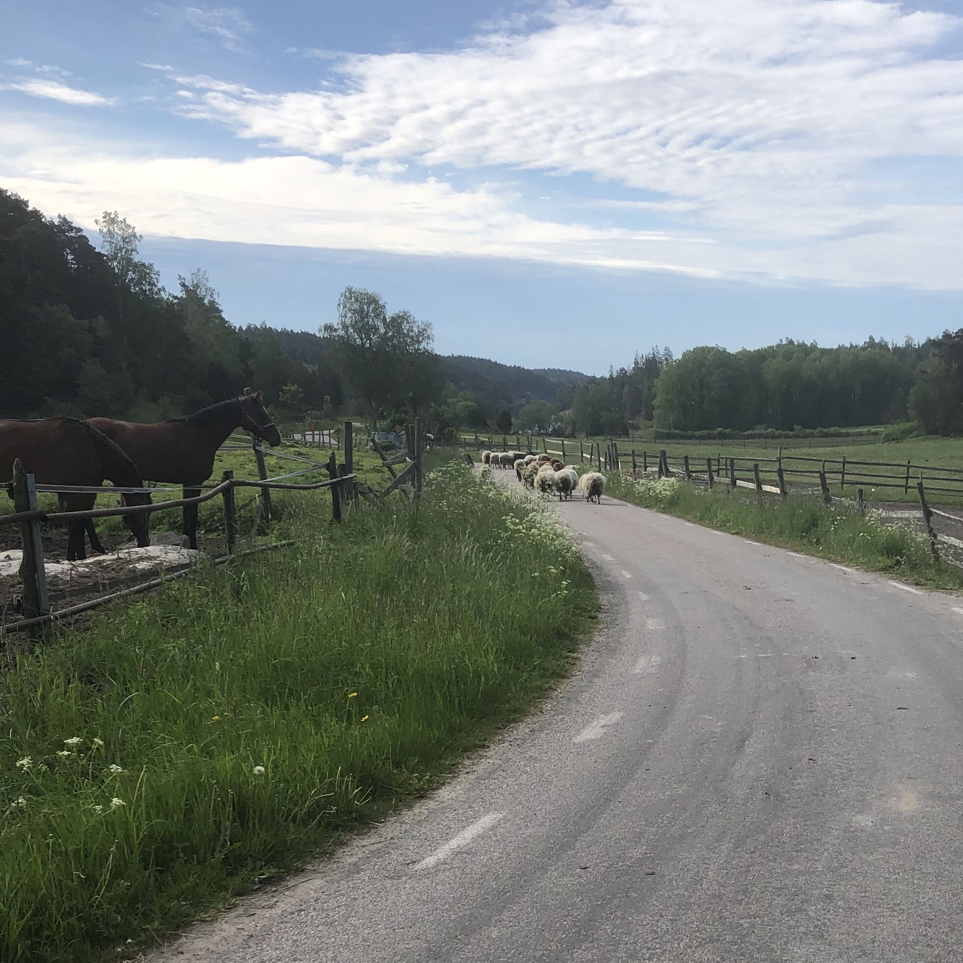 Jag cyklade tillbaka och fåren var fortfarande överallt på vägen och från motsatt håll från mig kom en bil som stannade och hindrade att fåren fortsatte nedåt på vägen. Jag rullade sakta mot fåren och tillsammans med bilisten fick vi fåren att lämna vägen och istället ta sig in i en hästhage. När fåren var inne i hagen lämnade jag mitt tillfälliga uppdrag som fåraherde till ägaren som förhoppningsvis var på väg. Hoppas han fick in dem i rätt hage igen 😄