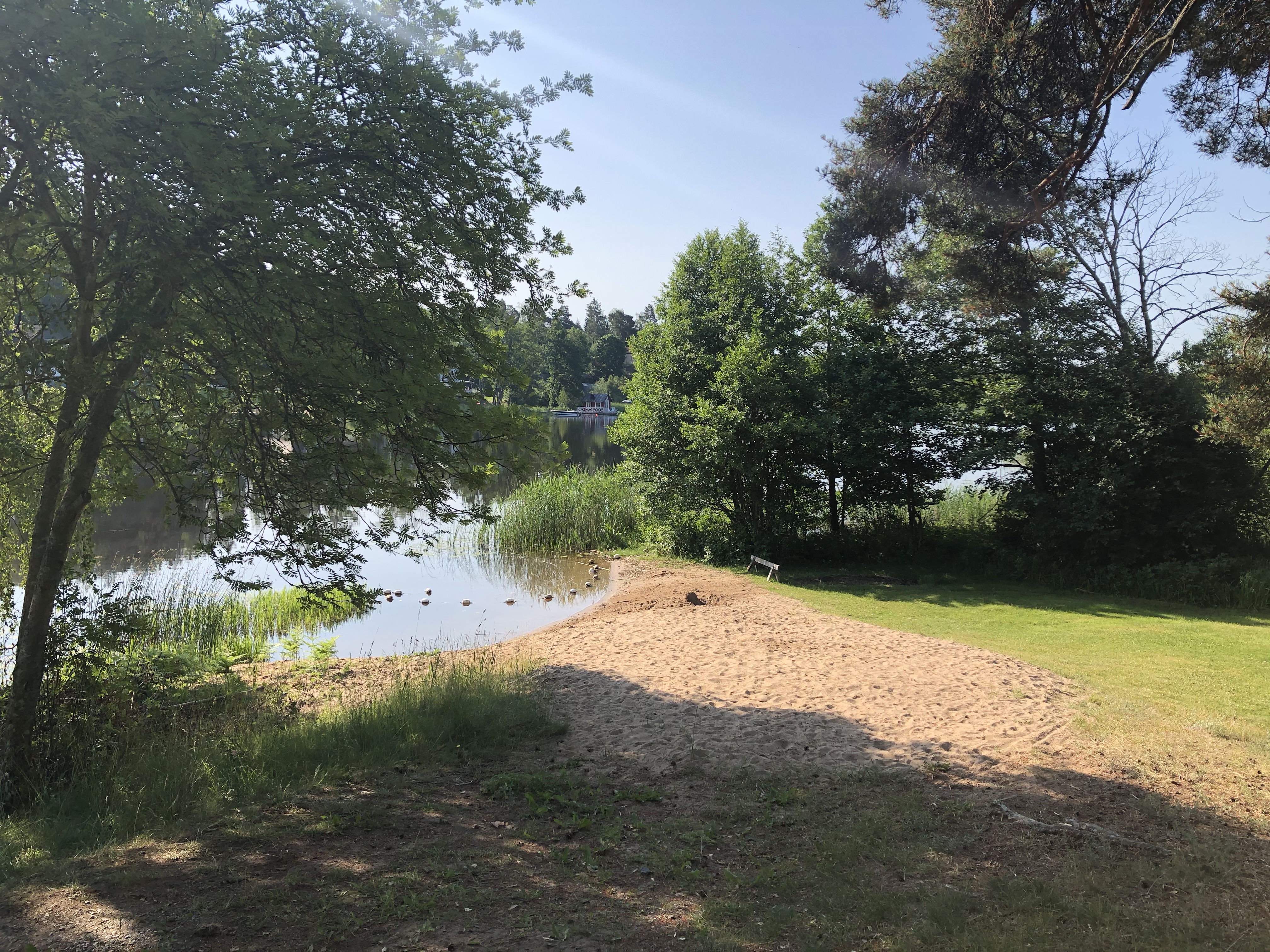 På slutet av min runda passerar jag ett ställe där det dagtid om sommaren brukar stå bilar parkerade. Det är en liten stig ned mot vattnet, men jag har aldrig utforskat den närmare. Idag svängde jag ned på stigen och vid stigens slut var det en liten brygga och en liten badstrand.