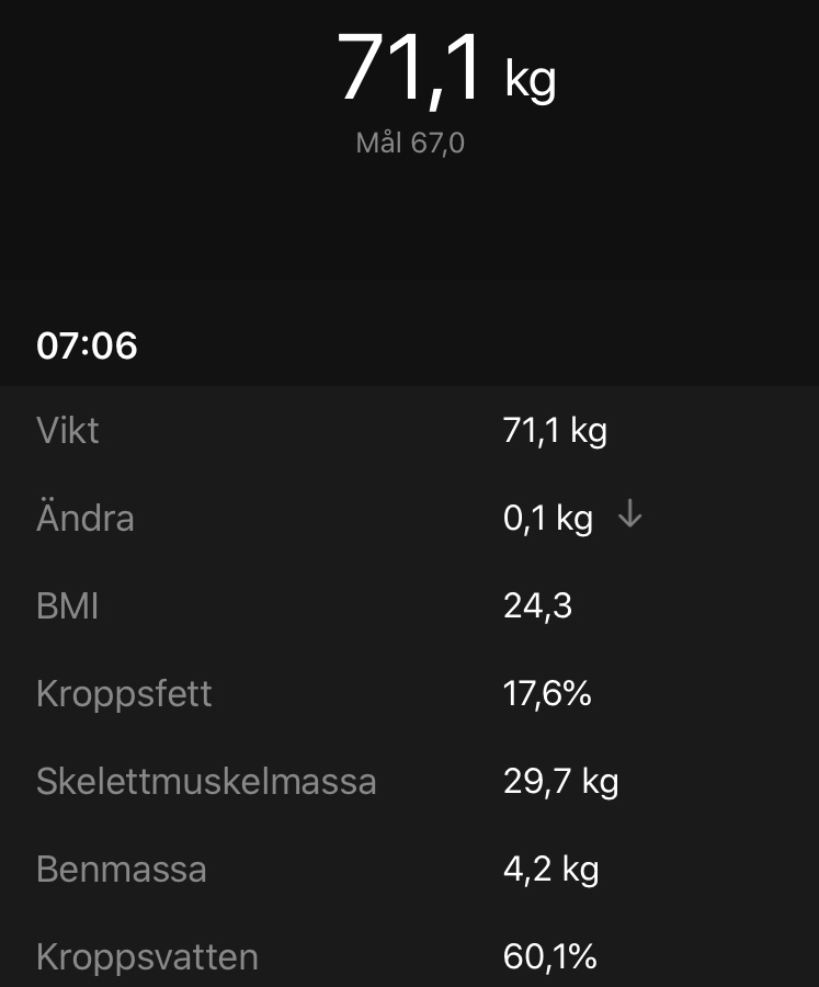Vikt idag: 71,1 kg (-1 kg sedan start)