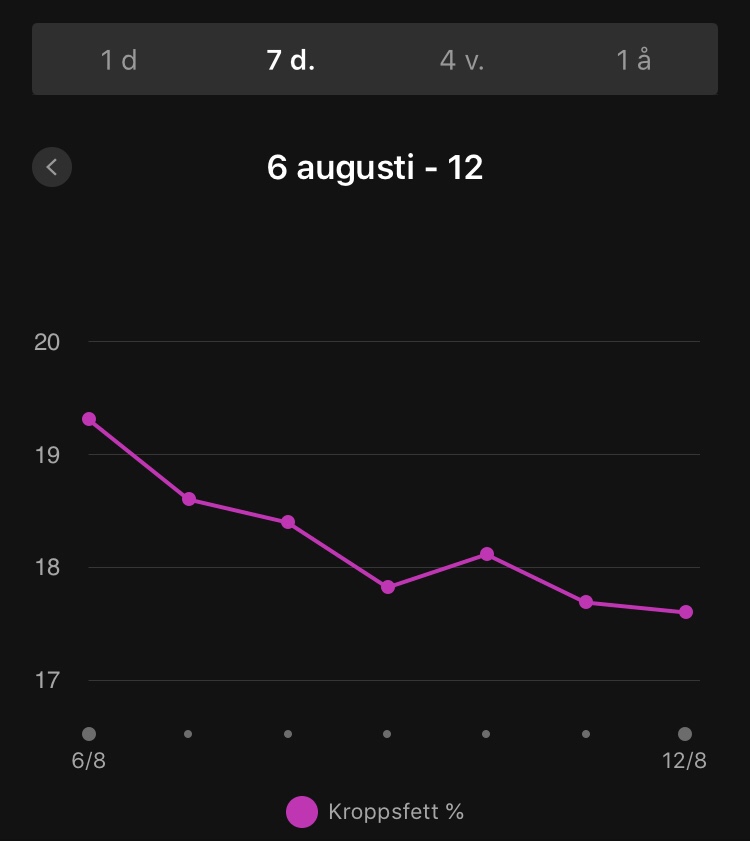 Vågen fortsatte visa mindre även idag och jag kan se en bibehållen vätskebalans i kroppen. Sedan noterar jag att trots att LCHF är en kost där man äter mycket fett, kan ni ändå se att min fettprocent gått ned sedan starten i diagrammet till höger.