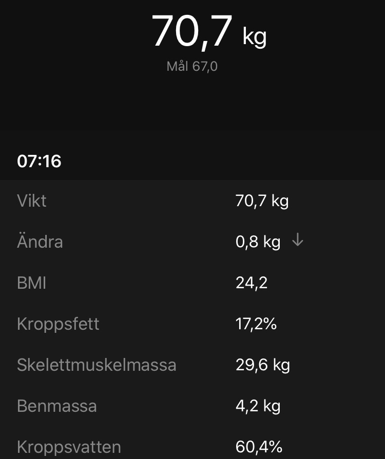 Denna vecka har vikten legat still eller stundtals visat mer än förra helgen, trots att jag pendelcyklat nästan alla dagar. Men mot slutet av veckan vände det nedåt igen.