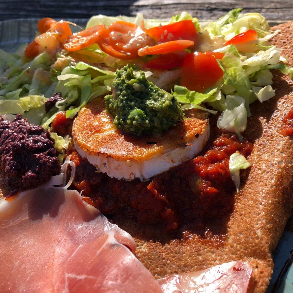 Efter ca 50 km var det lunchstopp som vårt favoritställe Kutens Bensin som är ett crêperie. Huvudnumren på menyn är Galette och jag beställde en med tomatfrikassé, chèvreost, serranoskinka och massa annat smaskens. Detta stopp är något av det bästa med cykelturerna här på Fårö förutom det vackra landskap man kan njuta av här.