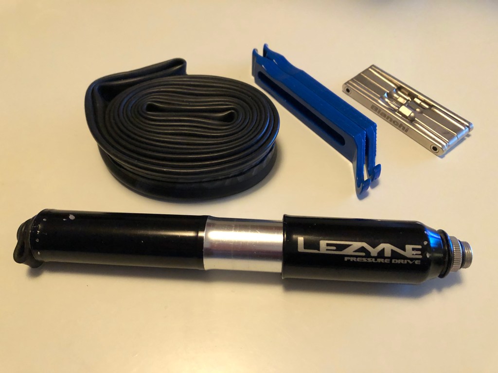 En extra cykelslang, ett däcksverktyg, ett mutifunktionsvertyg, en minicykelpump och ev. en kolsyrepatron med tillhörande däcksmunstycke. Dessa kan du med lätthet ha i bakfickorna på din cykeltröja och i en sadelväska. De flesta minipumpar kommer med fästen som man sätter i ramen under tex flaskhållaren.