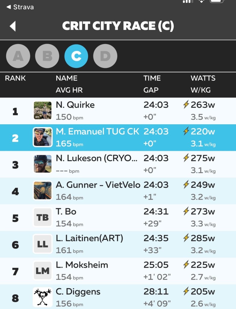 I slutspurten visste jag inte vem som vunnit, för det var så tajt mellan oss 4 i tätklungan. När jag sedan kollade resultatet fick jag en annan kille exakt samma tid. Tyvärr tilldelades han 🥇 och jag 🥈, men jag är lika nöjd för det. Kändes ändå bra att jag orkade hänga på dem hela vägen i mål och vann nästan…