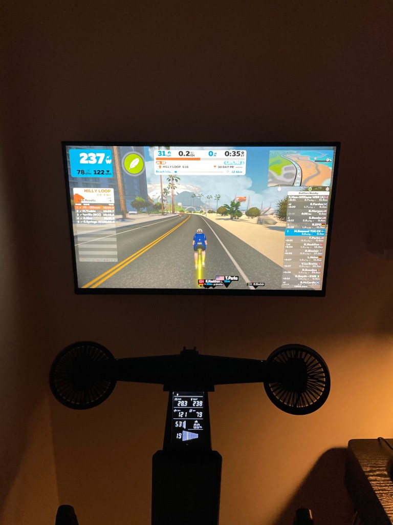 Jo, för att denna vecka kom min 27 tums skärm och Apple TV som jag beställt. Skärmen har jag nu monterat på väggen framför min cykeltrainer. Äntligen kan man läsa allt på skärmen när man kör Zwift utan glasögon 🤓