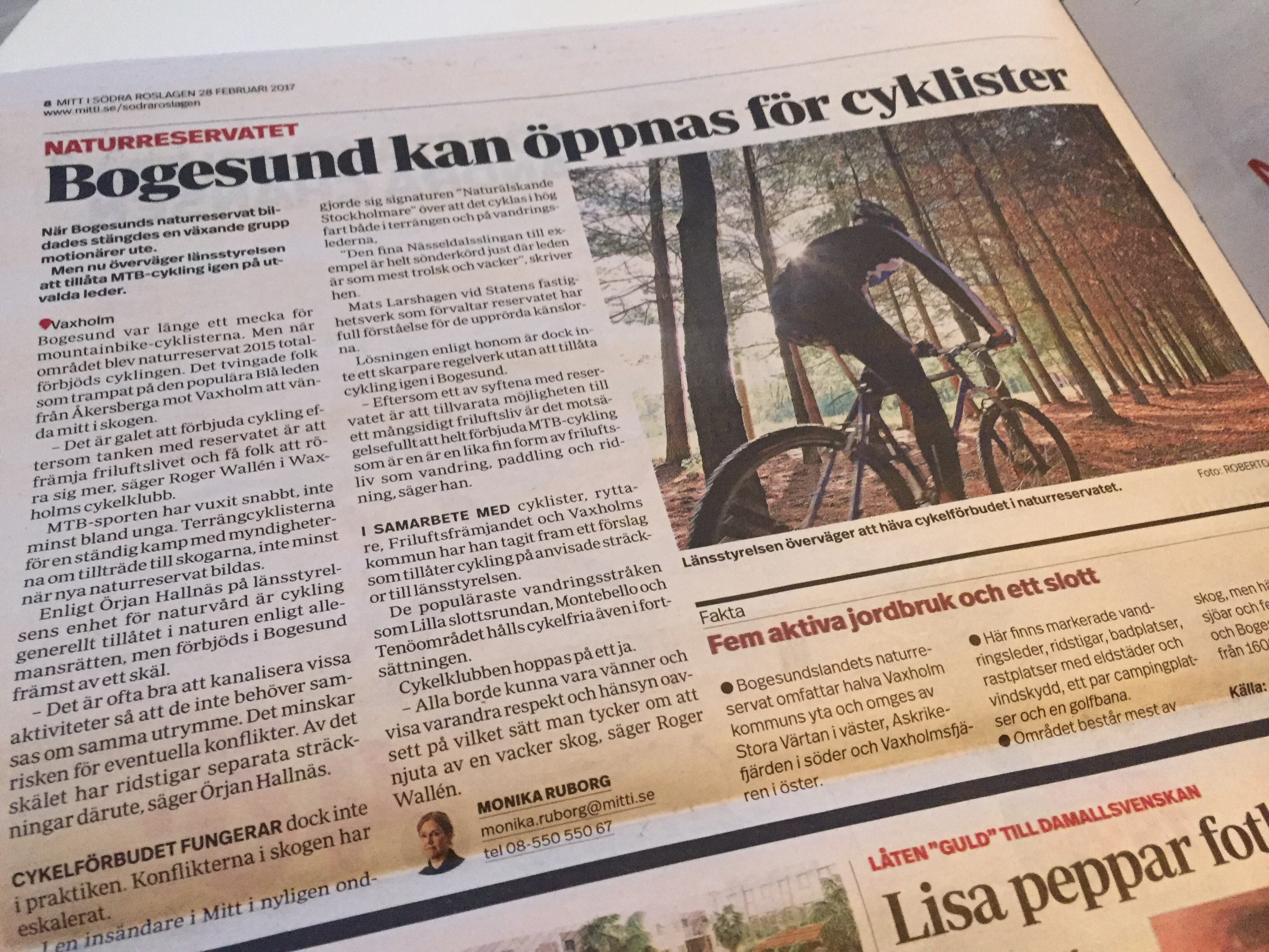 Blev så himla glad för en tid sedan då jag fick höra att Länsstyrelsen beslutat att häva cykelförbudet på utvalda leder på Bogesundslandet i Vaxholm. Nu idag såg jag en uppdaterad karta i MTB Täbys Facebookgrupp, där man kan se vilka leder som det åter är okej att cykla på. I övrigt är det förbjudet att cykla i terrängen, eftersom stora delar av Bogesundslandet är ett naturreservat.