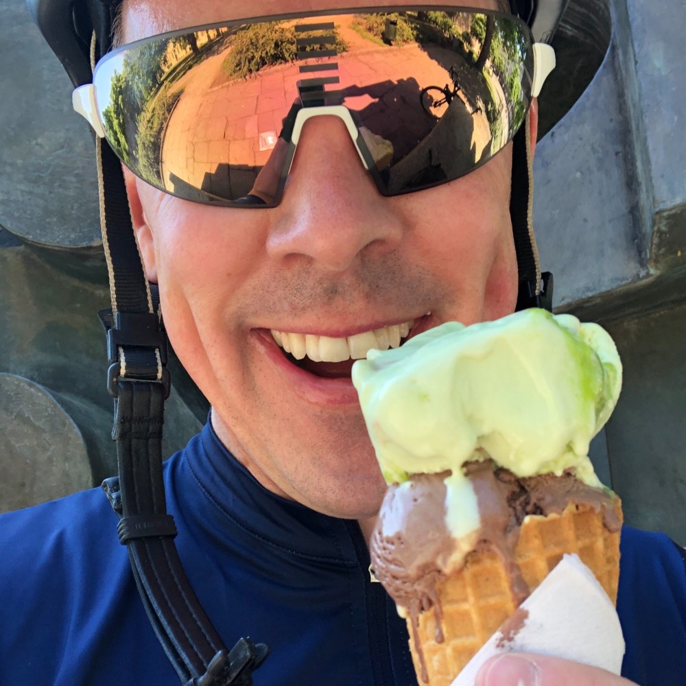Hämtningen gick bra och direkt efter bestämde jag mig för att slå till på en korv med mos som jag njöt av i skuggan av ett parasoll. Efter det blev det en härlig kulglass vid en glasskiosk. När jag skulle parkera cykeln och sätta mig i en park lyckades jag dock riva mig på en detalj på min cykel. Jag fick ett litet men rätt djupt skärsår på låret och även om jag satt kvar en stund och lät såret läka lite, öppnade det sig lite på vägen hem igen. Fick stanna och torka blod ibland, så det inte skulle se ut som jag varit utsatt för ett mordförsök 🤓