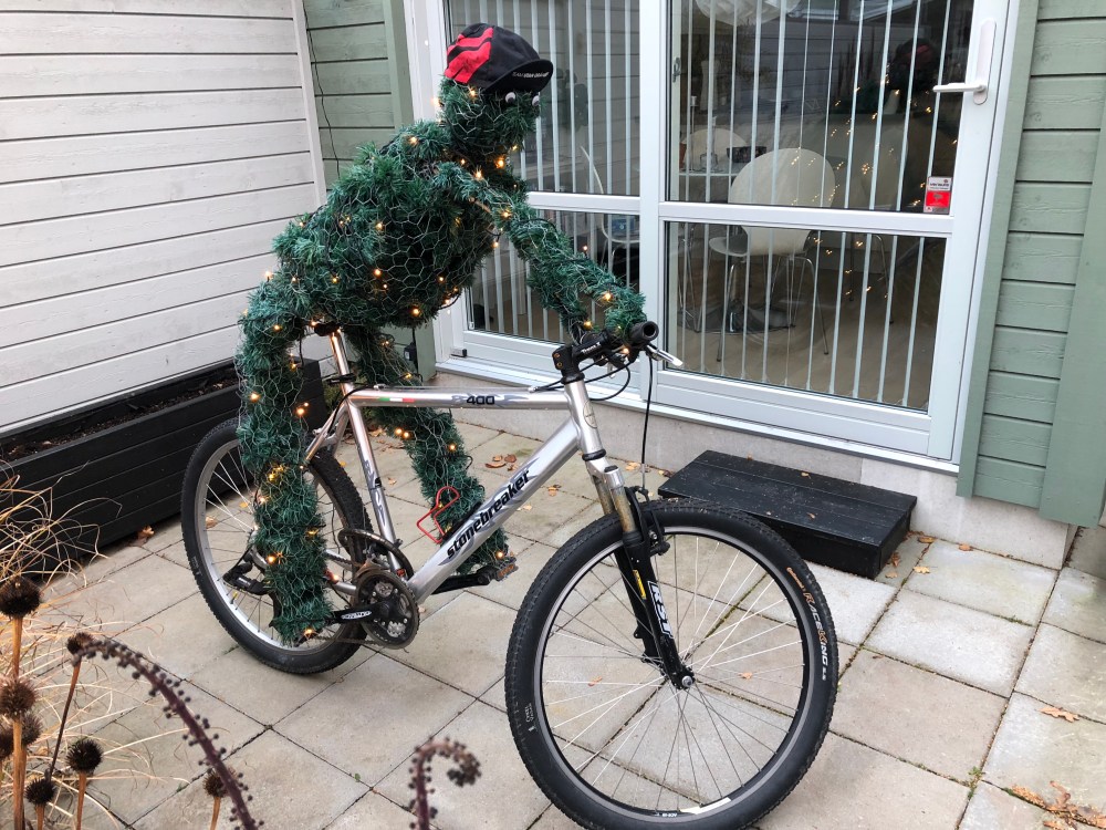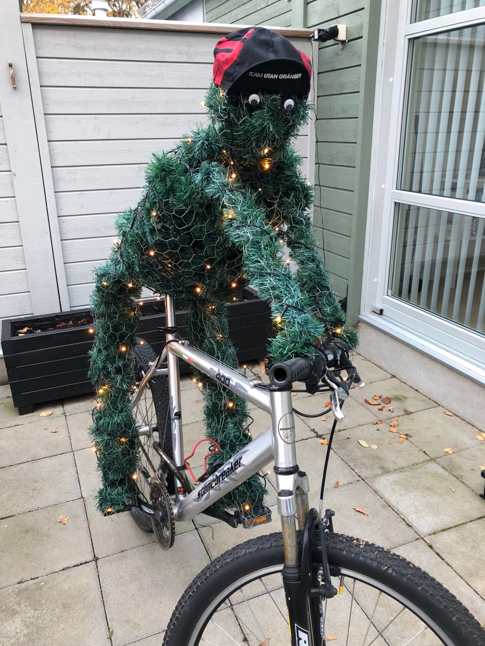 I vintras så kollapsade gatans mest annorlunda juldekoration, Mr Cyclist som jag kallar honom. Eftersom han är cyklist, så har han naturtroget tunna armar som inte pallade för trycket av snön som byggdes på hans rygg. Så plötsligt en dag orkande han inte längre och bonkade. Hans tunna armar hade givit upp och vek sig. Resultatet blev att han hängde som död fisk på cykeln.