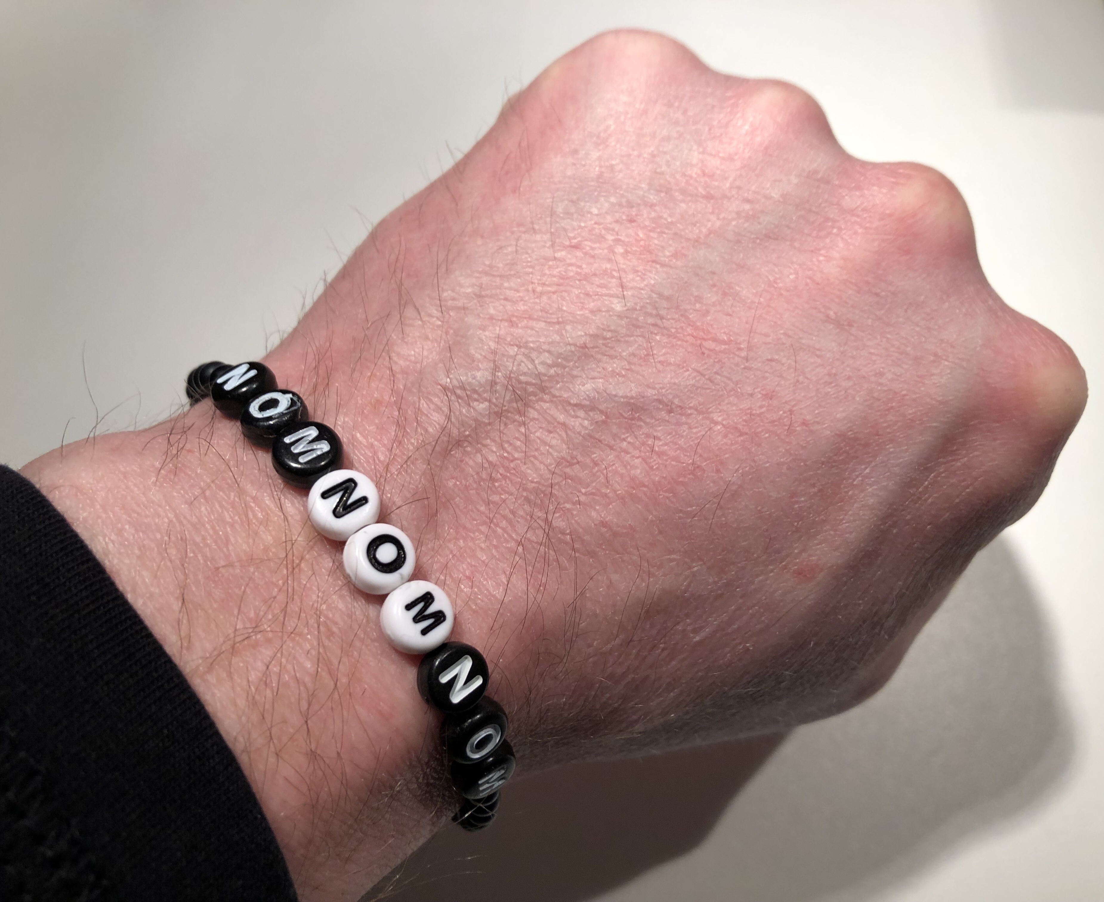 Hon hade gjort ett litet armband till var och en av oss i gruppen med en personlig sägning som hon förknippar oss med. Jag som gillar kakor och godsaker brukar rätt ofta säga nomnomnom när det vankas sötsaker. Ida, tack för att du tagit dig tid och göra detta personliga ”avslut” som jag vet att du inte vill kalla det. Vi ses på måndag 🙂