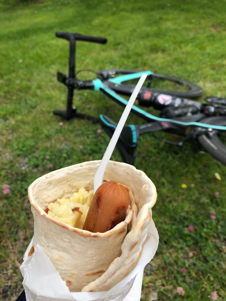 Väl uppe i Norrtälje tog jag en sväng inne i stan och utmed en liten kustremsa förbi småbåtshamnen. Innan jag vände hemåt igen stannade jag på ett klassiskt gatukök och njöt av en tunnbrödsrulle i gräset.