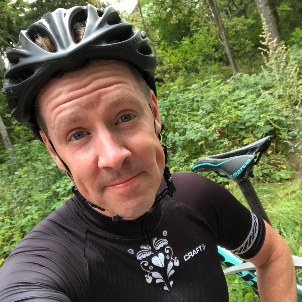 Fånigt nöjd efter en sväng på Hacksta Trail