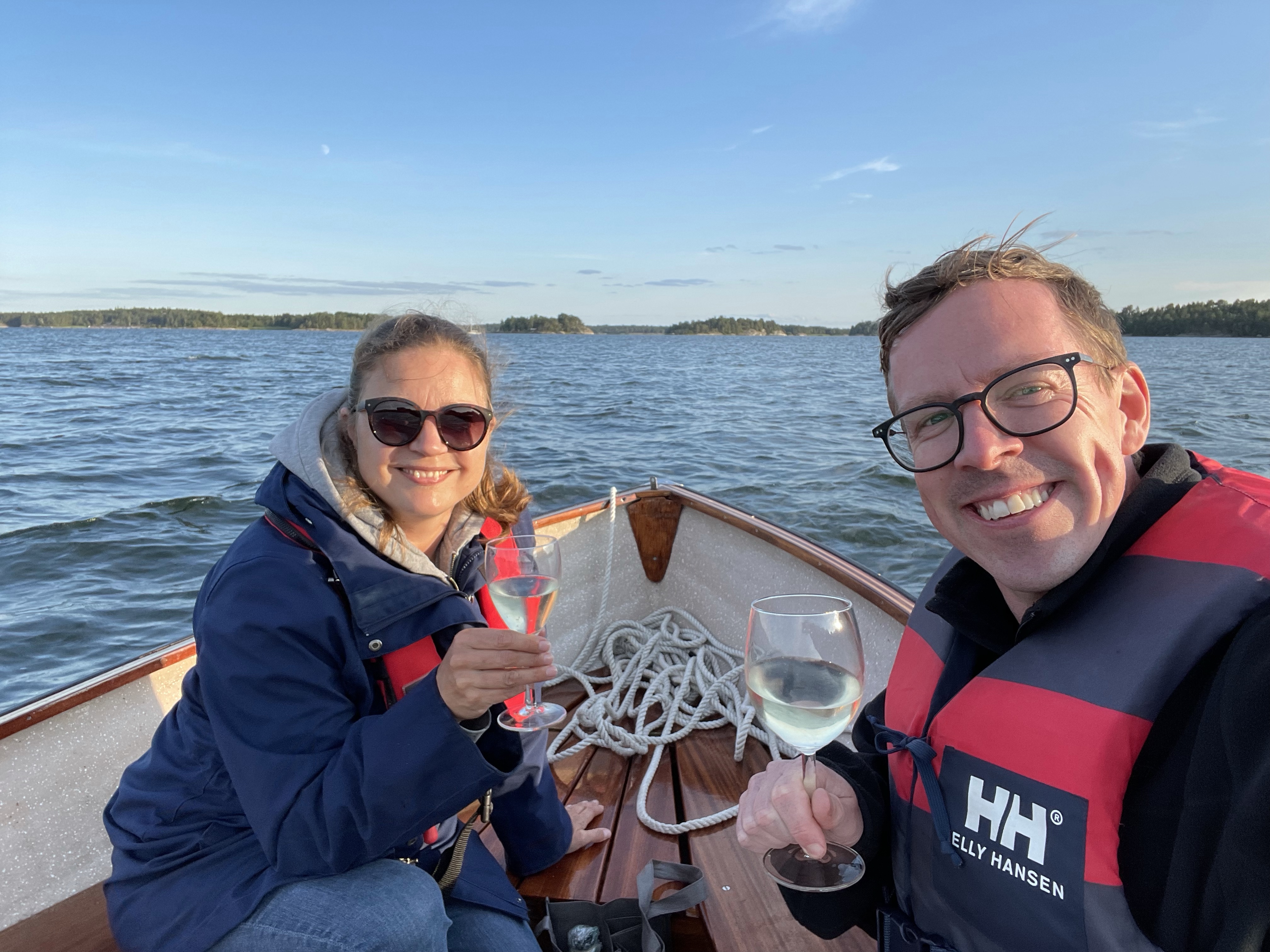 Under mitt dygn hos Lena med familj bjöds jag på god mat, dricka och härligt sällskap. Jag fick mig även en rundtur på ön till fots och senare på kvällen även en rundtur runt ön i familjens lilla elmotorbåt, där vi skålade i solnedgången.
