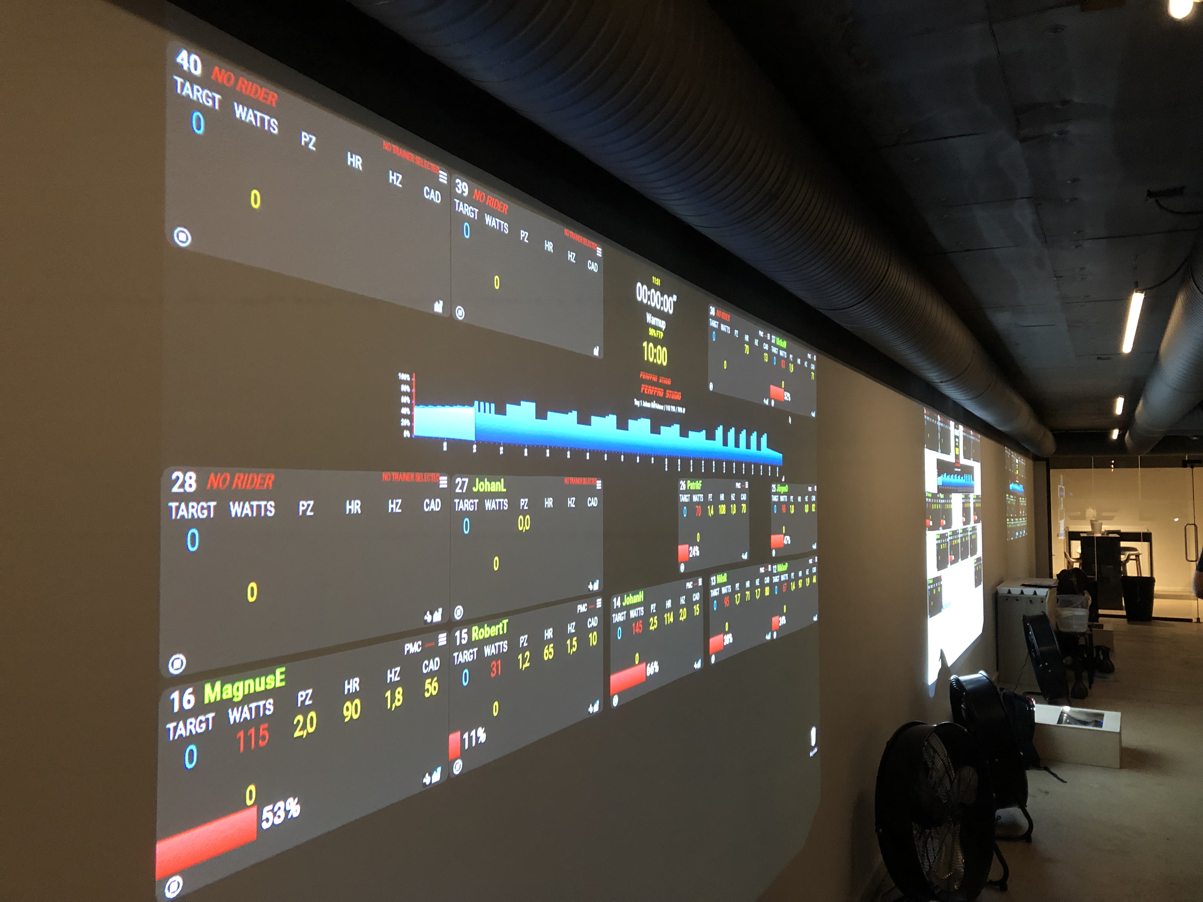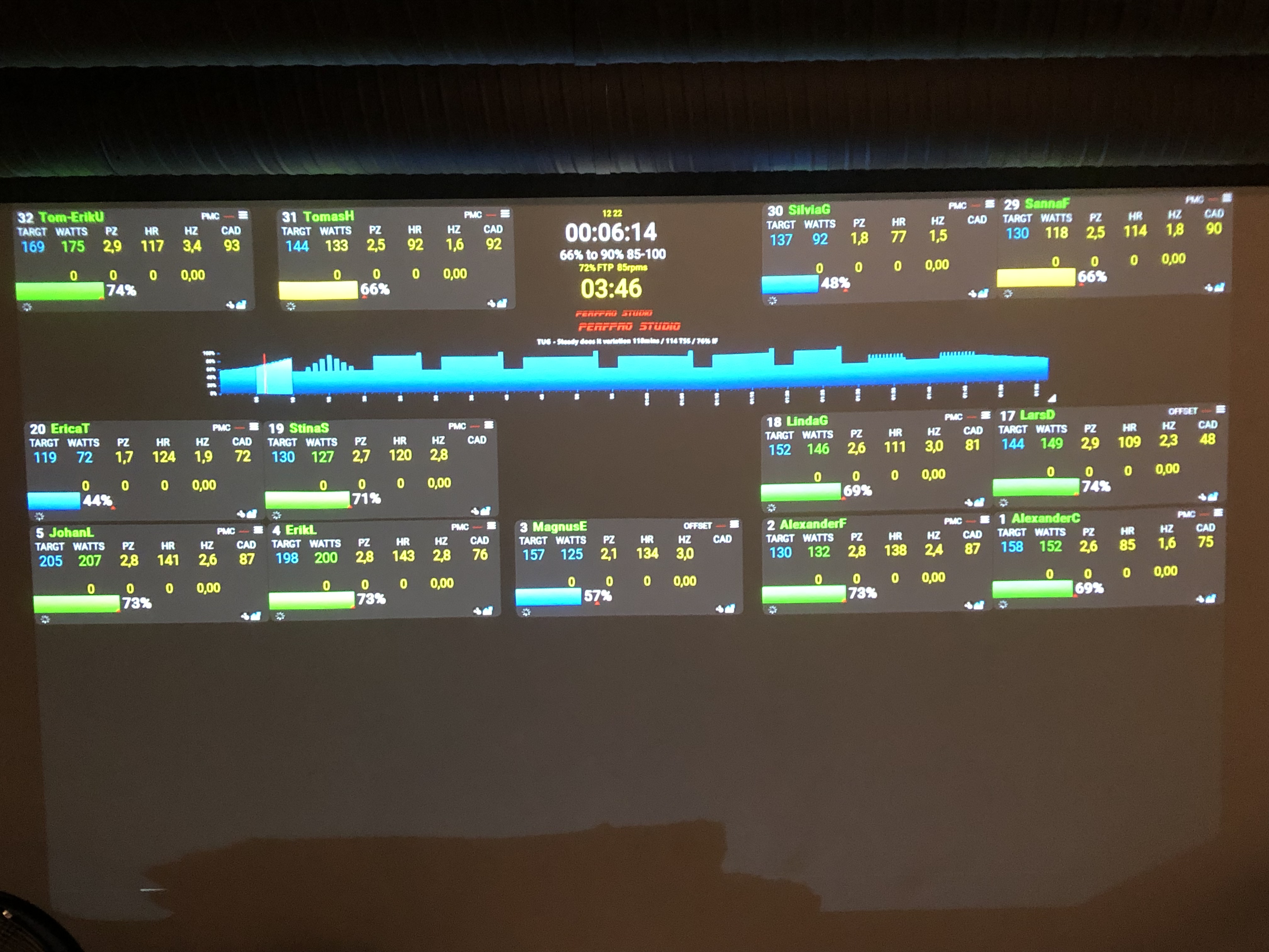 Jag hade personligen lite strul med tekniska idag och under flera gånger slutade pulsprylen som man har på armen att skicka signaler till cykeln och skärmen framför oss på väggen. När jag egentligen kanske låg på en puls på 175 så visade den 55. Eftersom detta är ett lite nytt sätt att spinna och visa data för de som deltar, så är det väl lite barnsjukdomar med det tekniska gissar jag. Det var var jätteskoj ändå!