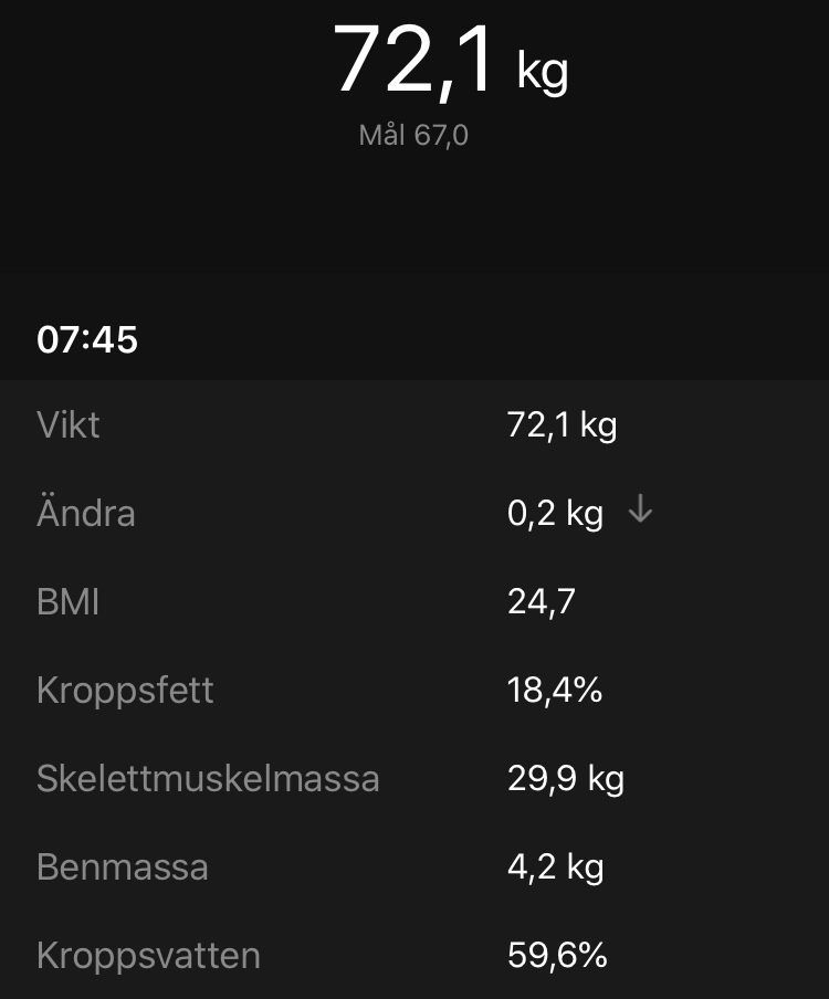 Vikt idag: 71 kg (-1,1 kg sedan start)